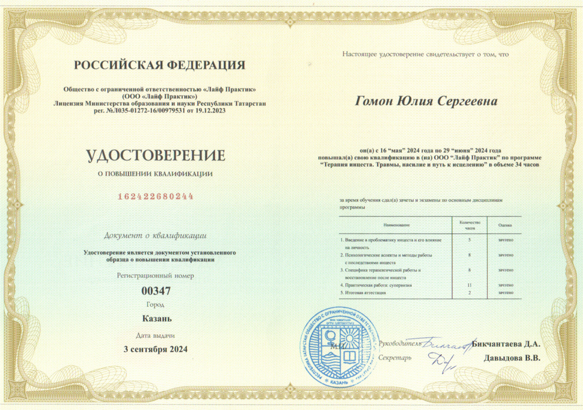 - Прохожу личную терапию, что помогает мне лучше понимать процессы, происходящие в терапевтических отношениях, и постоянно работать над собственным развитием