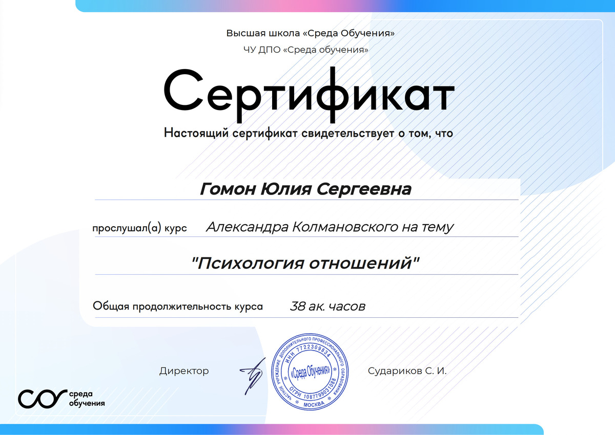 Я дипломированный психолог в области семейного и индивидуального консультирования, но считаю, что настоящий специалист никогда не перестаёт учиться. Сейчас я углубляю свои знания и навыки, обучаясь экзистенциальной терапии в Институте гуманистической и экзистенциальной психотерапии (HEPI).